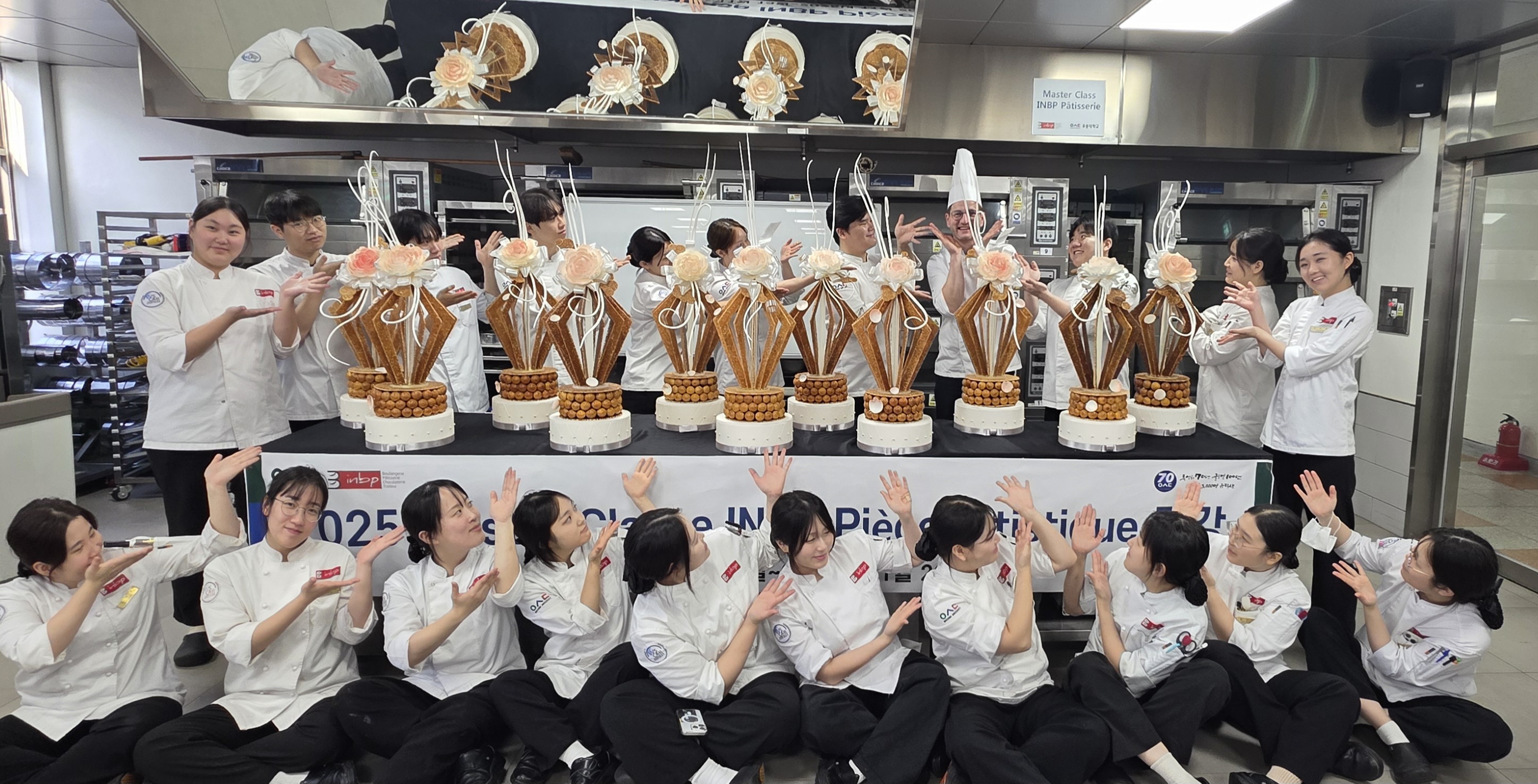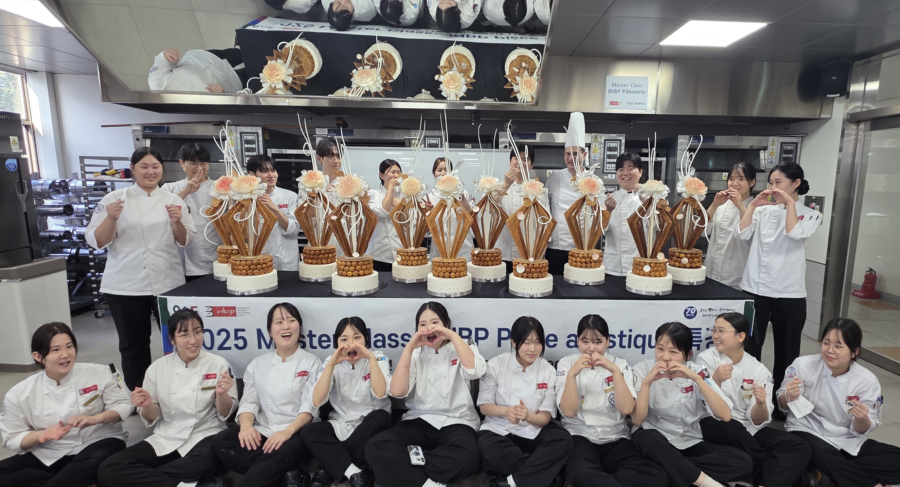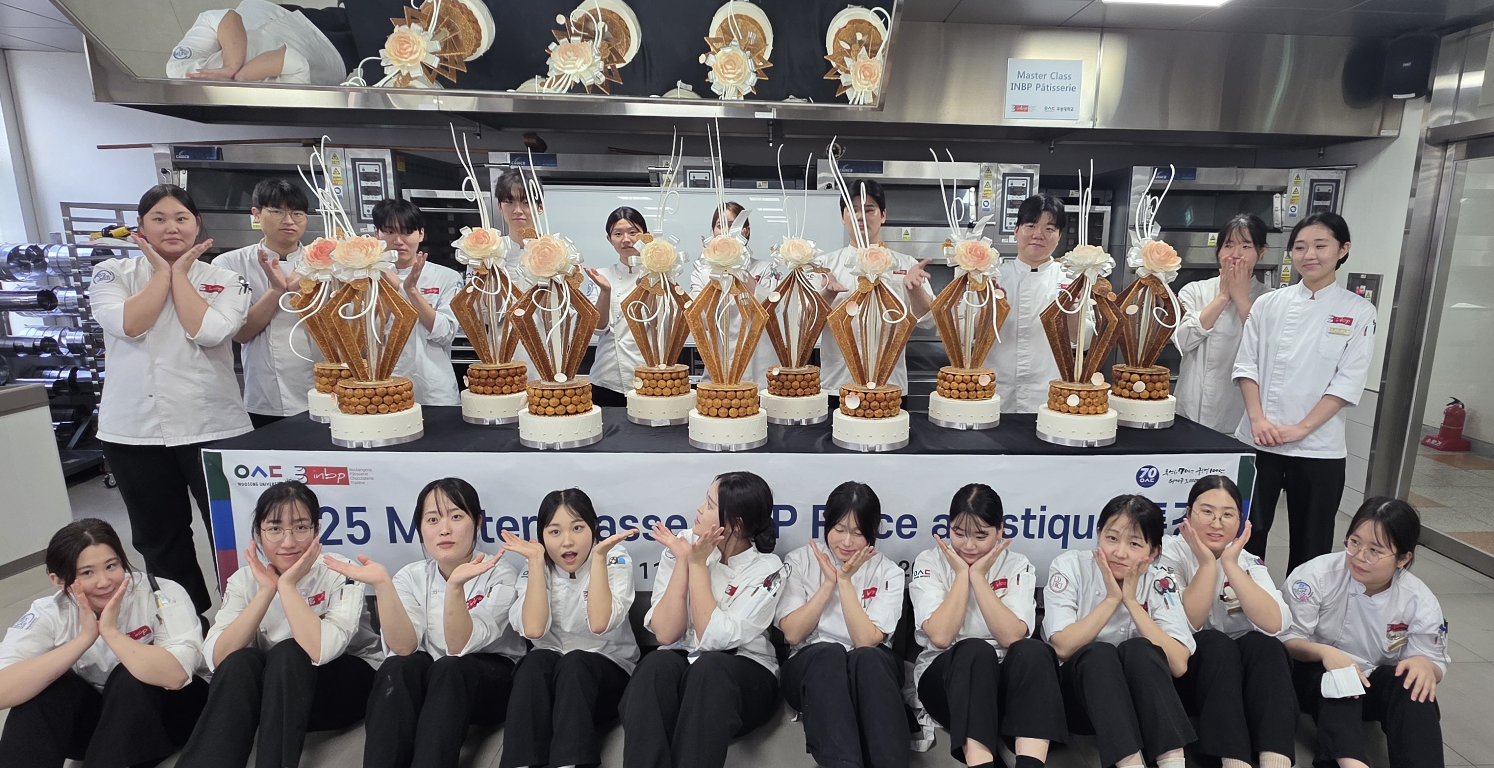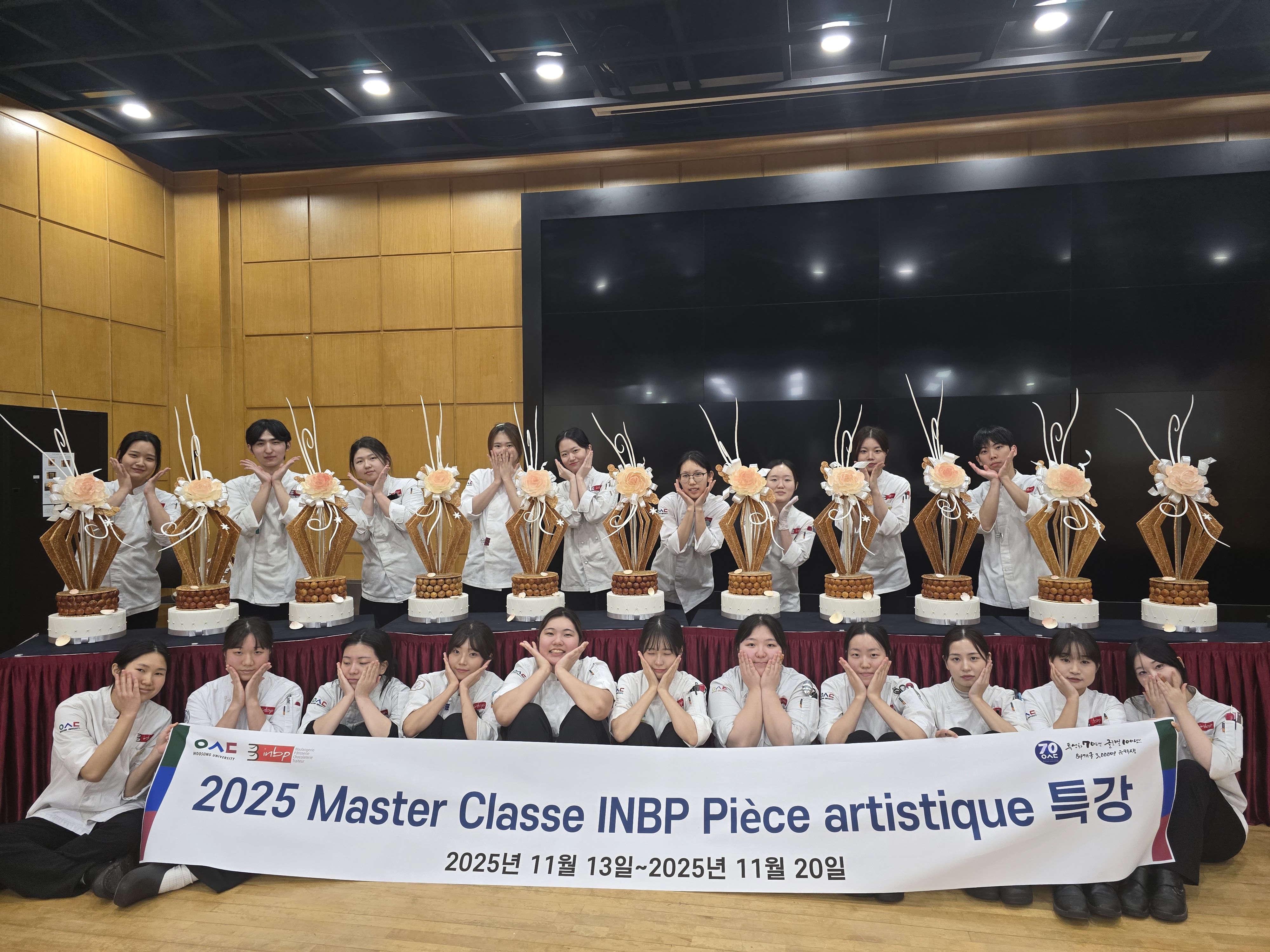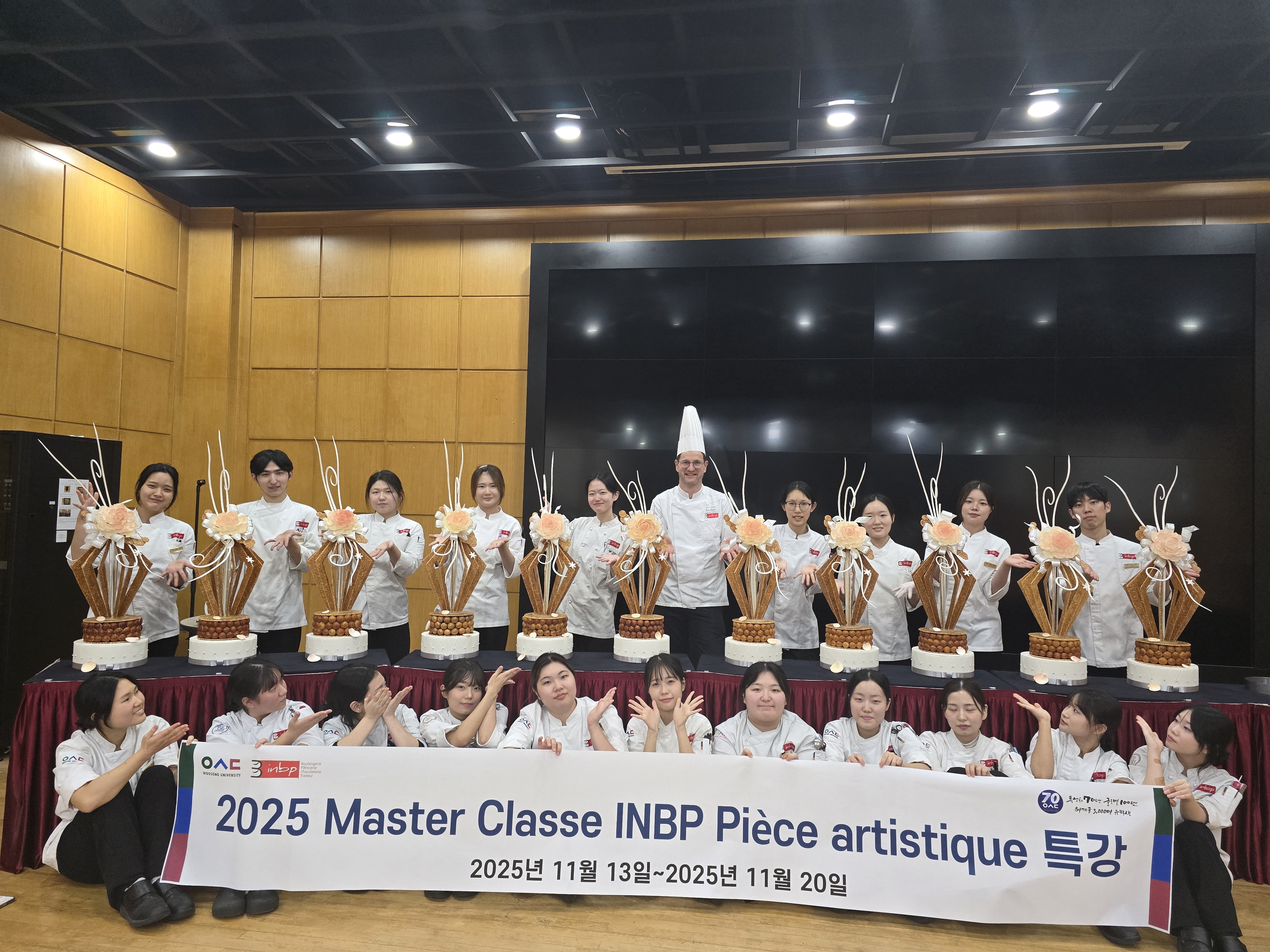 2025 11 10일부터 11일까지 3차 시험을 마친 후프랑스 INBP Jean-pierre GODIER교수님과 함께 13일부터 20일까지 Module 7 : initiation au croquembouche et sucre tire 수업이 진행되었습니다학생들은 choux nougatine 그리고 sucre tiré를 이용한 ruban을 기본으로 하여 pièce montée 와 우송대&INBP 두 가지 제품을 만들었습니다.