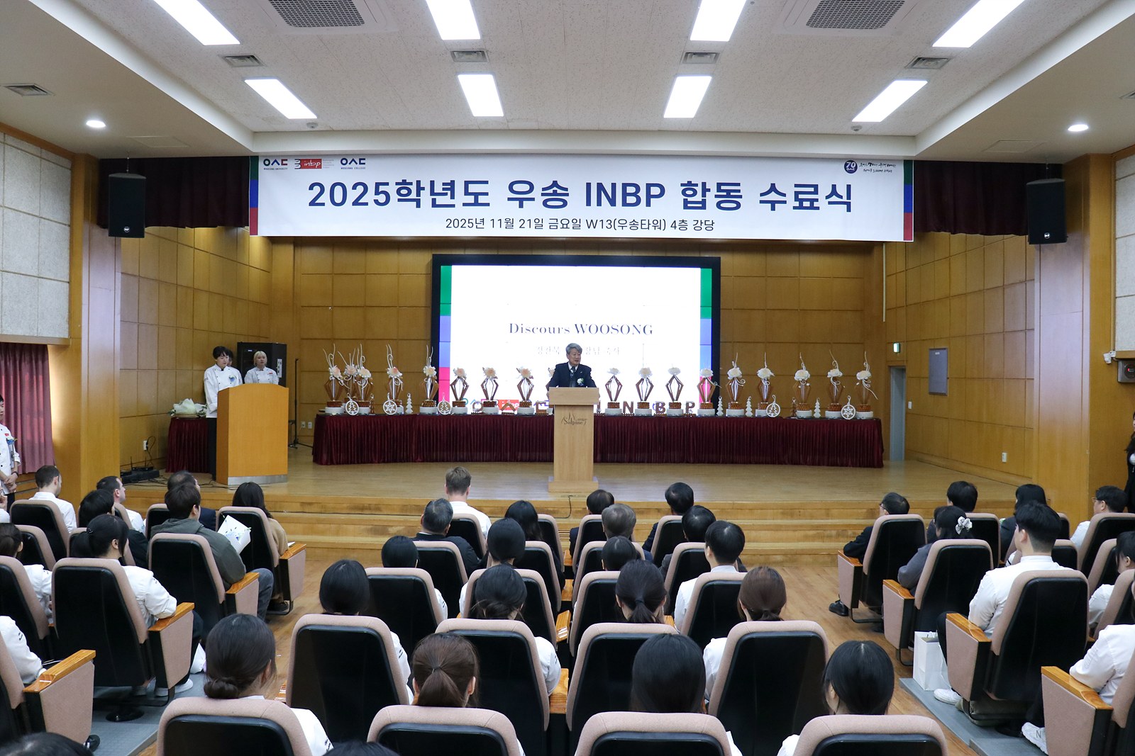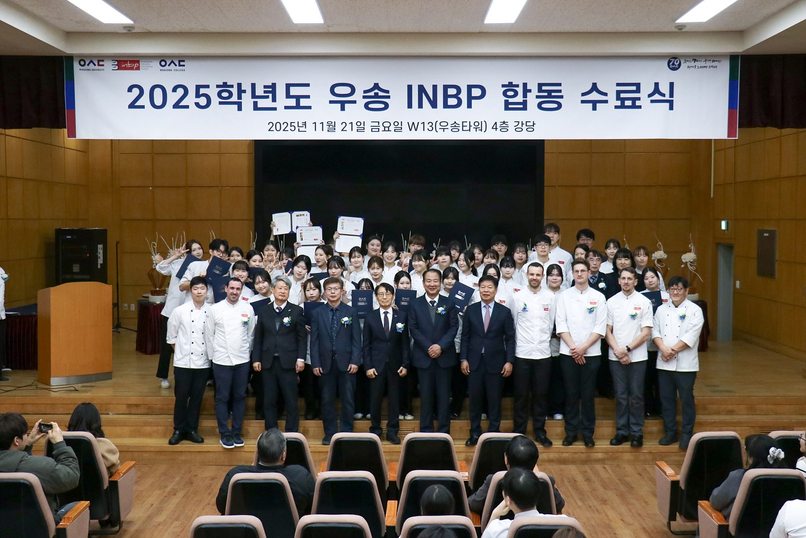 이번 수료식에는 우송정보대 손동현 총장님을 비롯해 우송대 정찬묵 부총장님, 민상기 우송정보대 부총장님,  이용환 우송정보대 부총장님, 우송대 오석태 학장님, 이태규 교학부총장님, 김학만 대외부총장님, 우송정보대 제과제빵학부 서상욱 교수님, 그리고 INBPJean-pierre GODIER 교수님과 Thomas  MAHOU 교수님 등 많은 내빈께서 참석하여 자리를 빛내주셨습니다