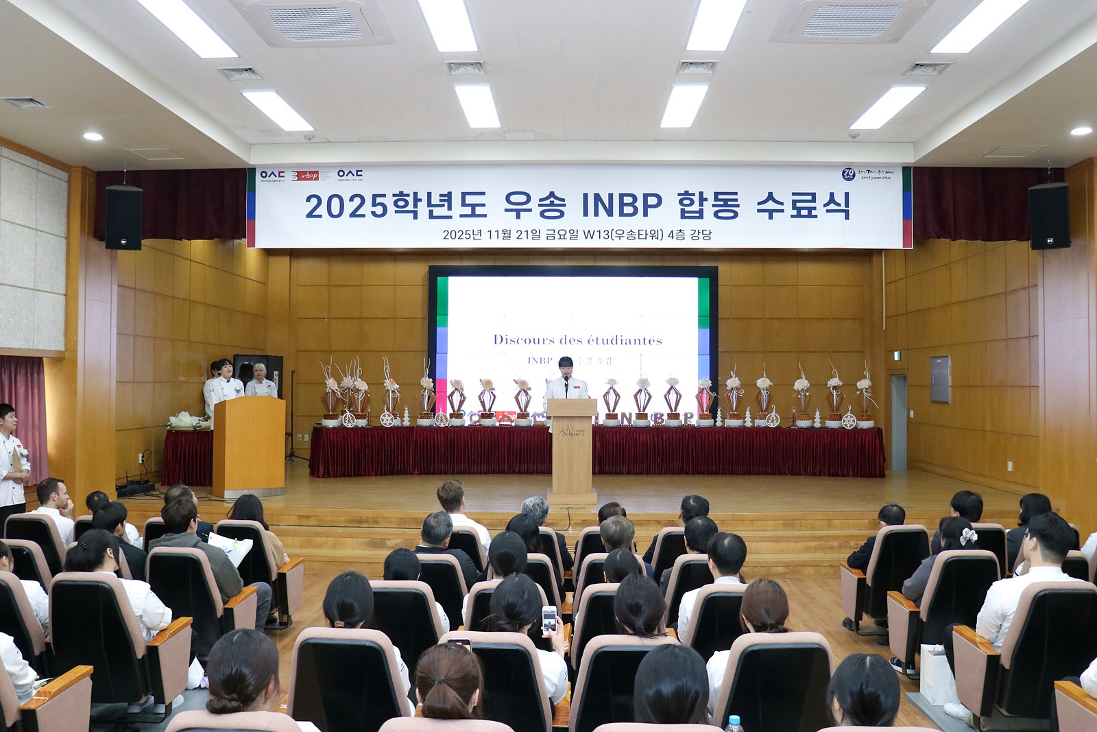 이어 학생들에게 프랑스 INBP 과정의 디플롬이 수여되며, 지난 1년 동안의 노력을 격려하는 시간이 마련되었습니다. 특히, 우수학생으로 선발된 우송대의 채민희 학생과 우송정보대의 김민영 학생은 소정의 선물과 꽃다발을 받으며 모두의 축하와 환호 속에서 영광의 순간을 맞이했습니다. 이들의 노력과 열정은 다른 학생들에게도 큰 귀감이 되었습니다.